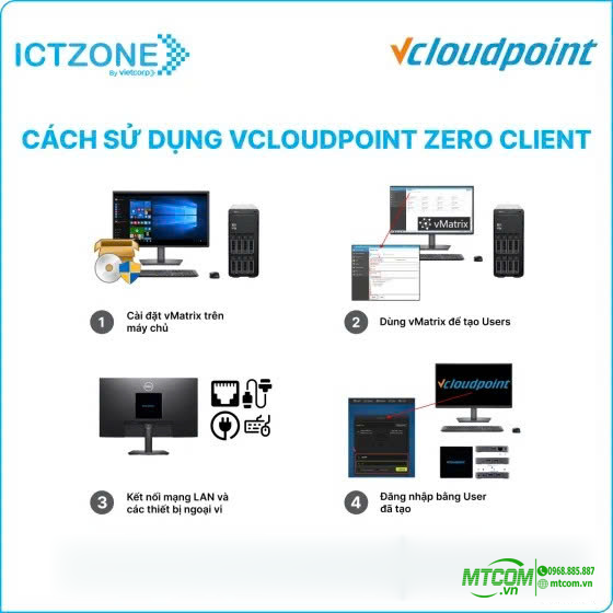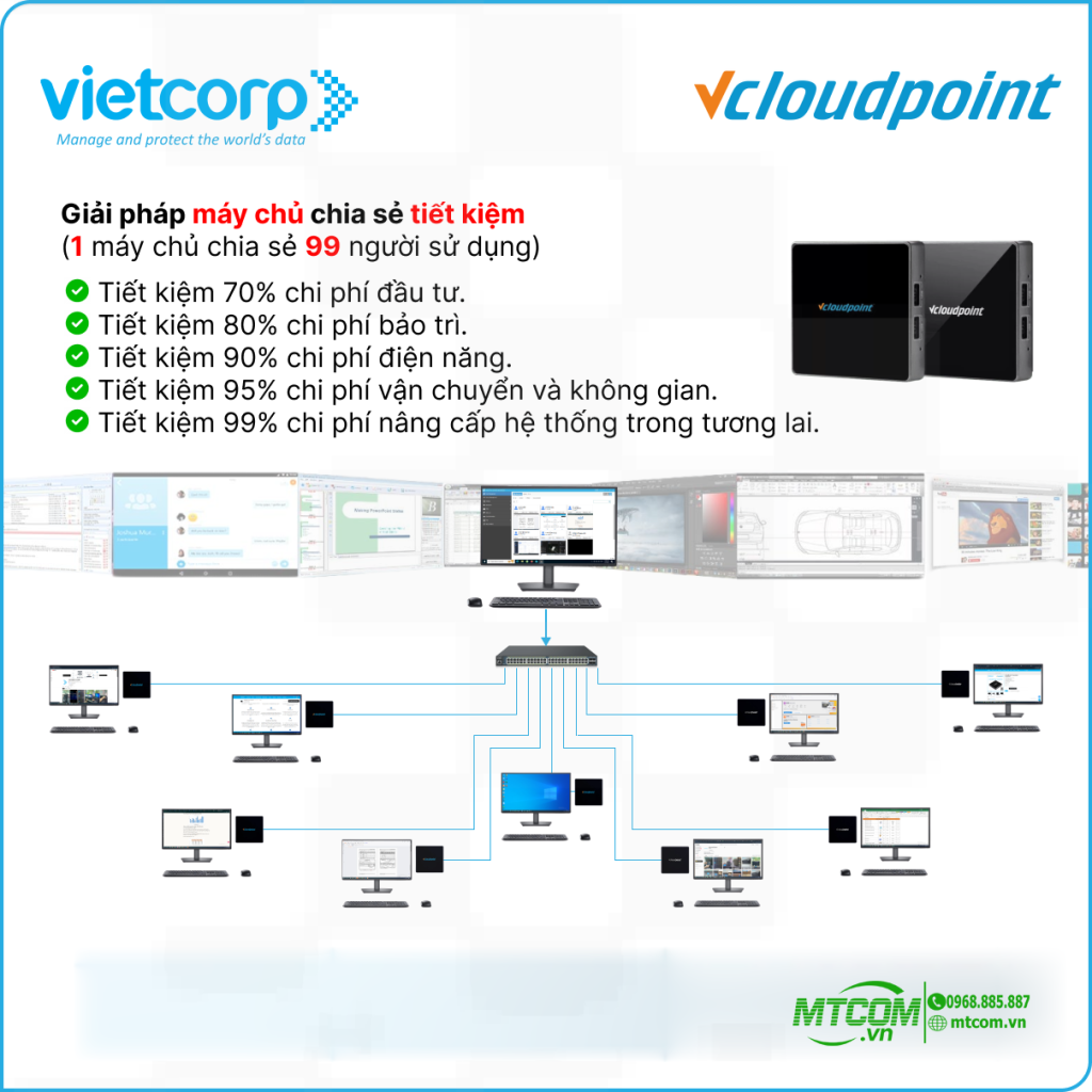 vCloudPoint V1 là thiết bị máy trạm (zero client) cho phép nhiều người dùng kết nối vào một máy chủ trung tâm. Mỗi người có tài khoản riêng, môi trường làm việc riêng, nhưng toàn bộ dữ liệu và phần mềm được quản lý tập trung trên server.
